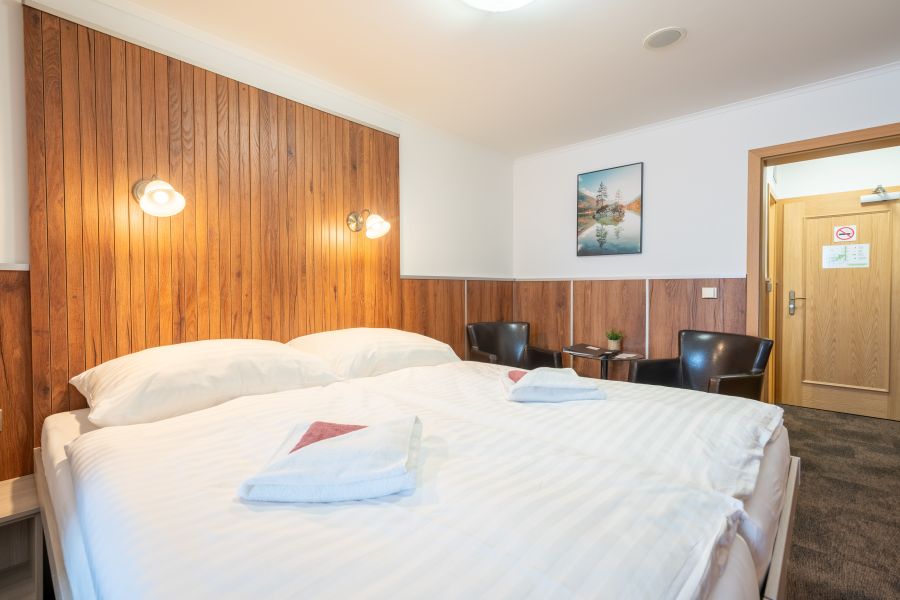 Dvoulůžkový pokoj s manželským lůžkem. Na pokoji je LCD televizor, ručníky, osušky a vysoušeč vlasů. K dispozici je internetové připojení WI-FI.