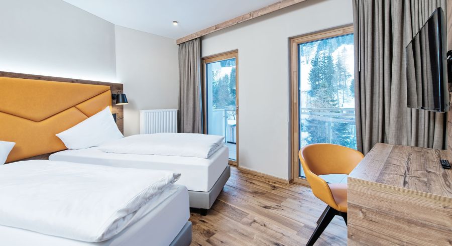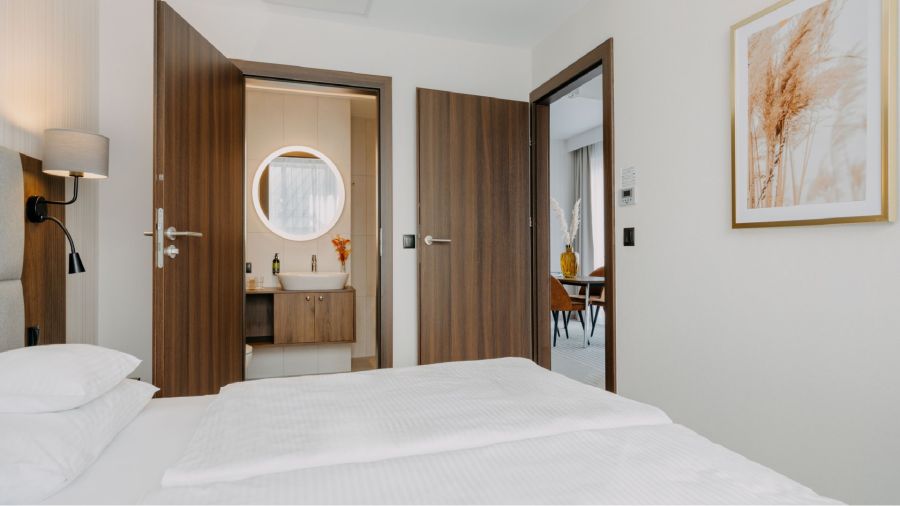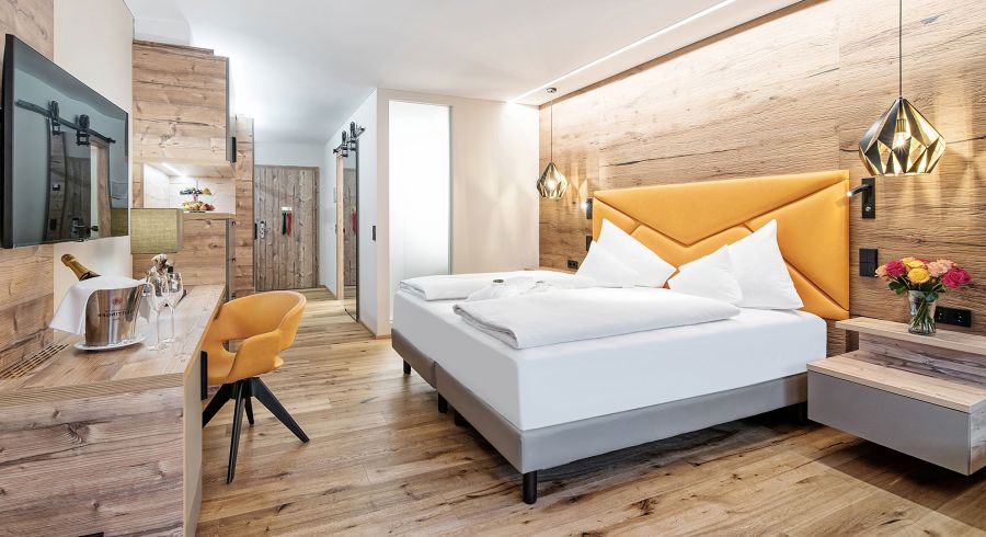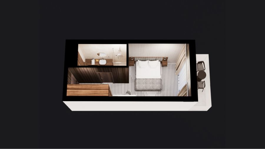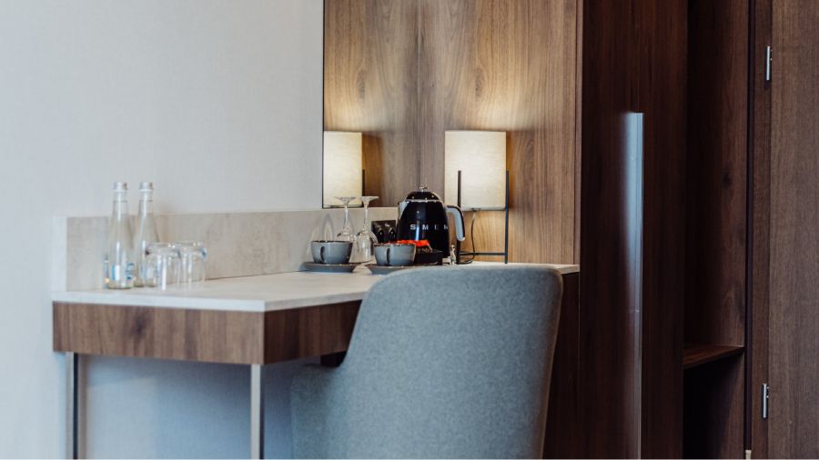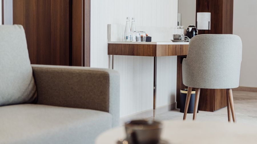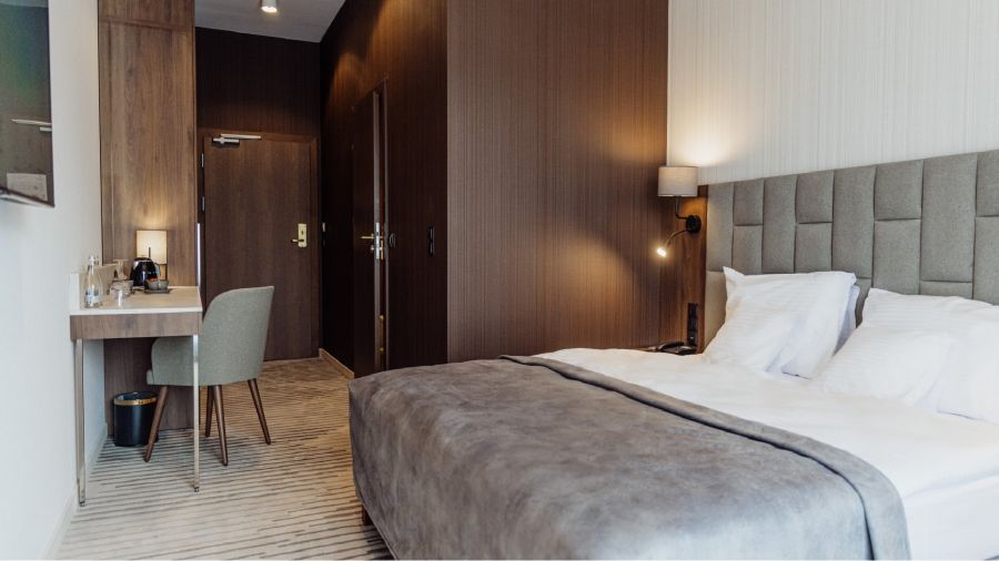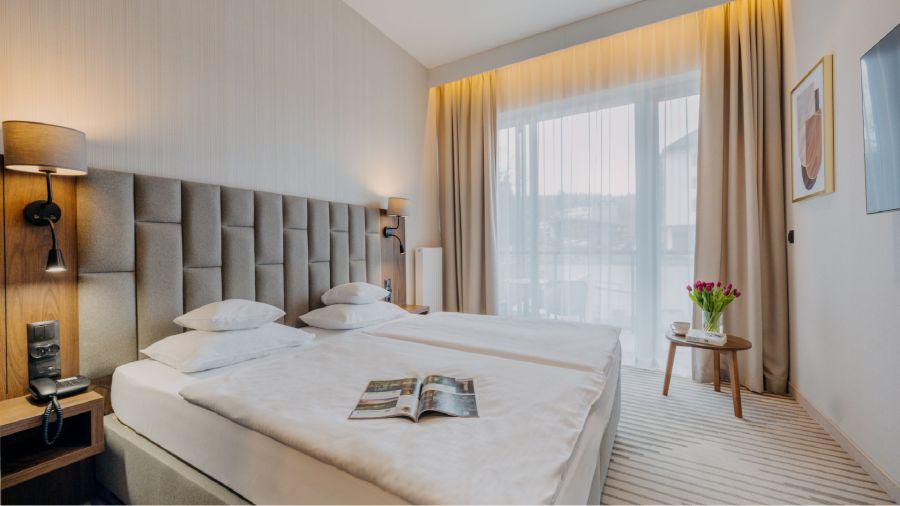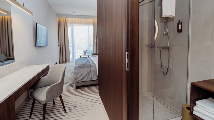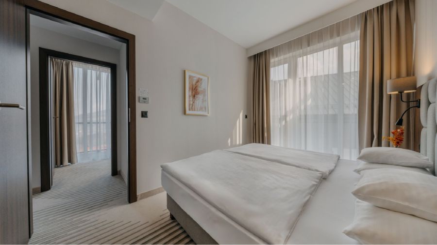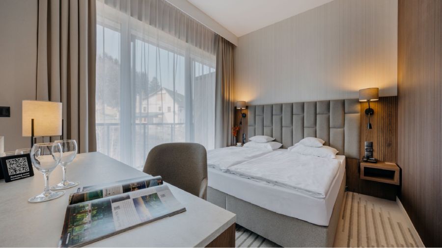 Dvoulůžkový pokoj DeLuxe nabízí komfortní ubytování o velikosti 27 m² v moderním stylu. Pokoj disponuje balkonem, klimatizací, TV, Wi-Fi, minibarem, trezorem a pracovním stolem. K dispozici je koupelna se sprchou, fénem a kosmetickým setem, nechybí župany, pantofle ani čajový a kávový servis.