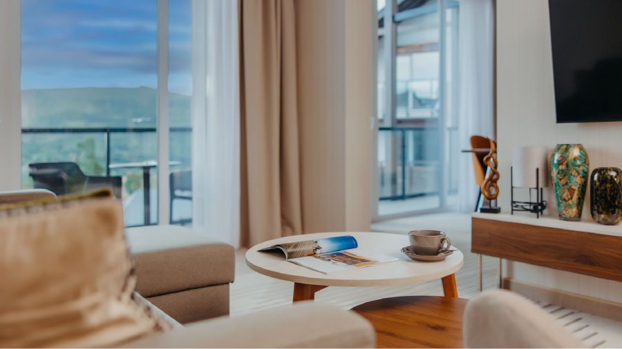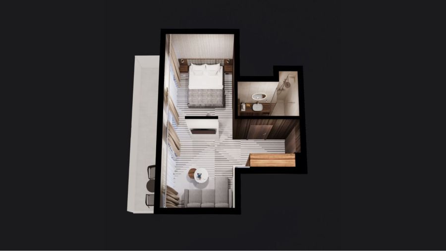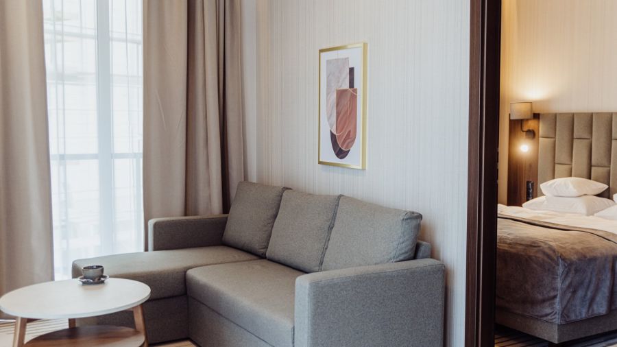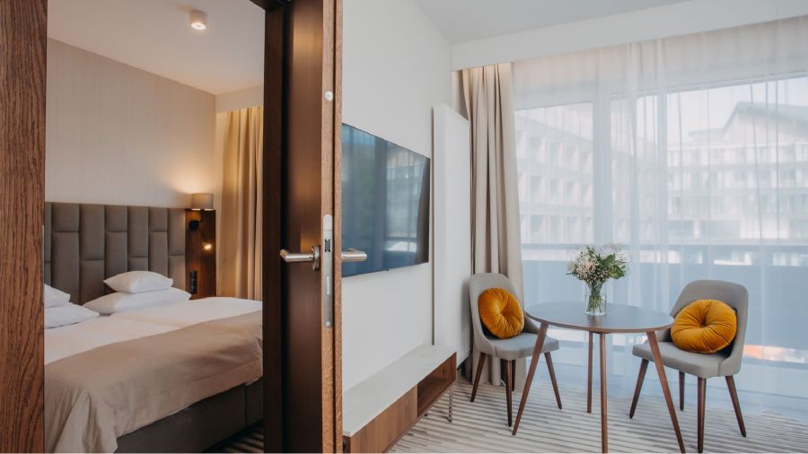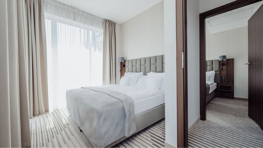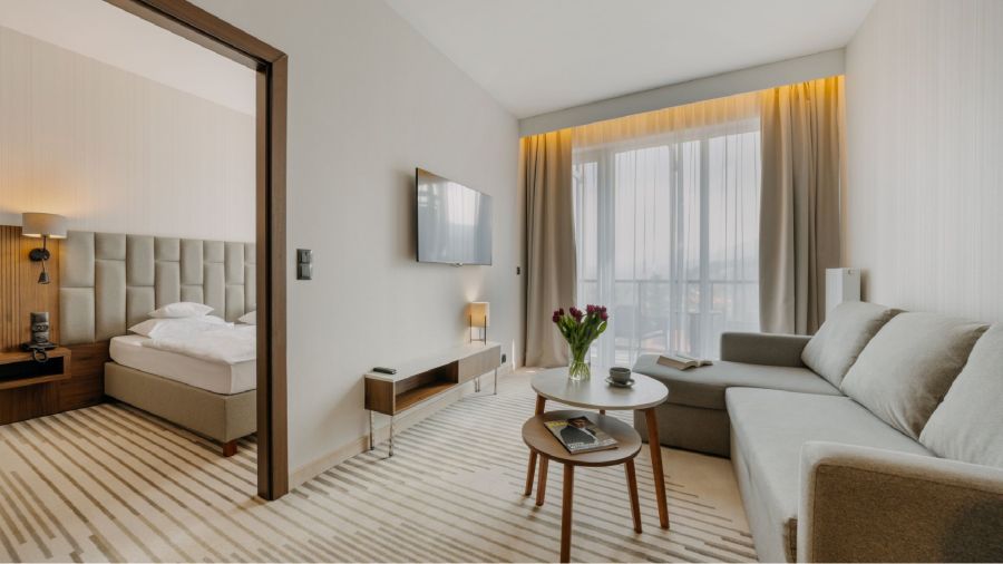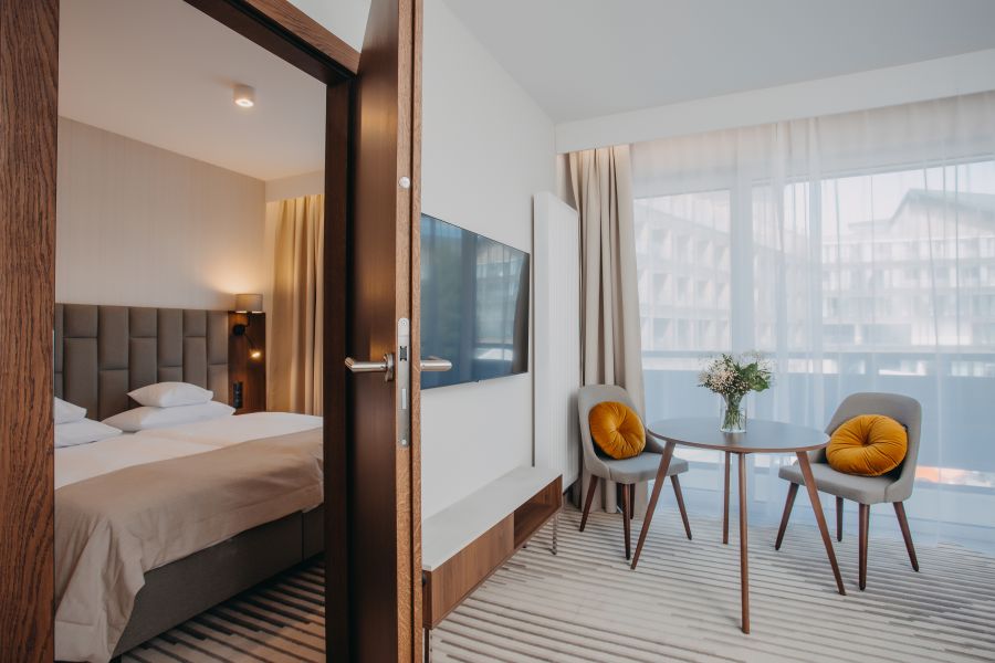 Dvoulůžkový pokoj DeLuxe Plus nabízí prostorné ubytování o velikosti 43 m² se dvěma místnostmi – ložnicí a obývacím pokojem. Pokoj je vybaven balkonem, klimatizací, TV, Wi-Fi, minibarem a trezorem. Nechybí koupelna se sprchou, fénem a kosmetikou, stejně jako župany, pantofle a čajový a kávový set.