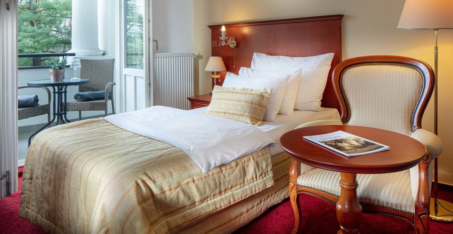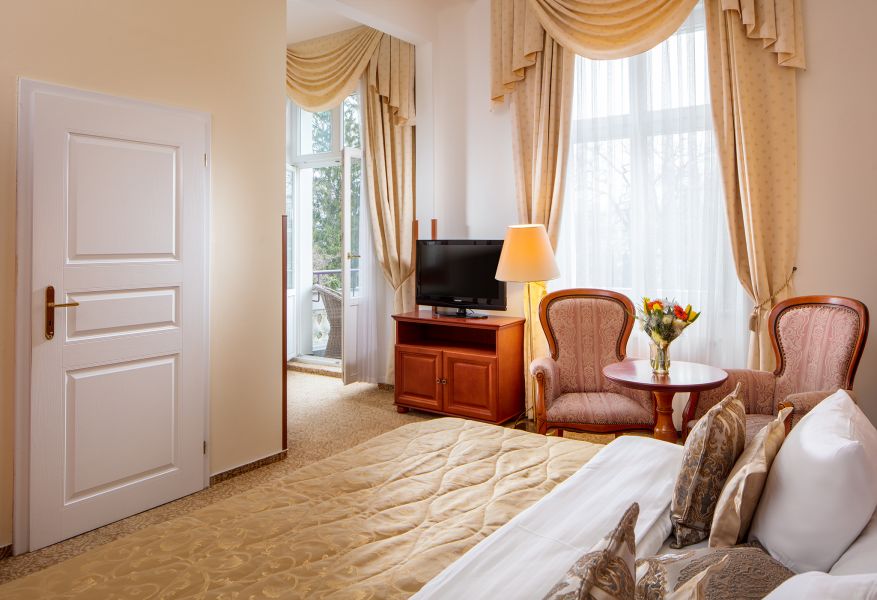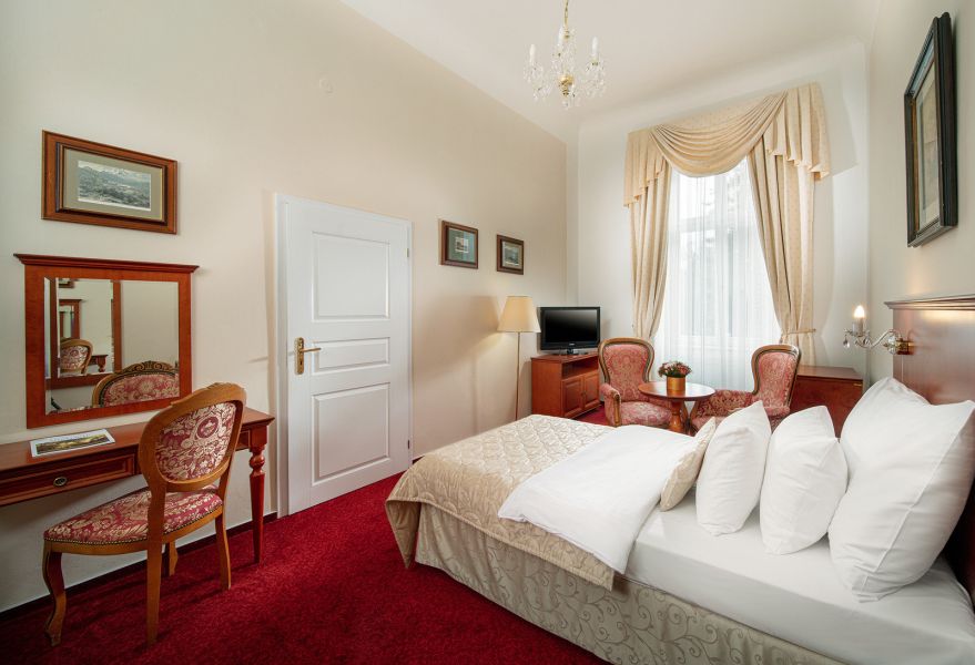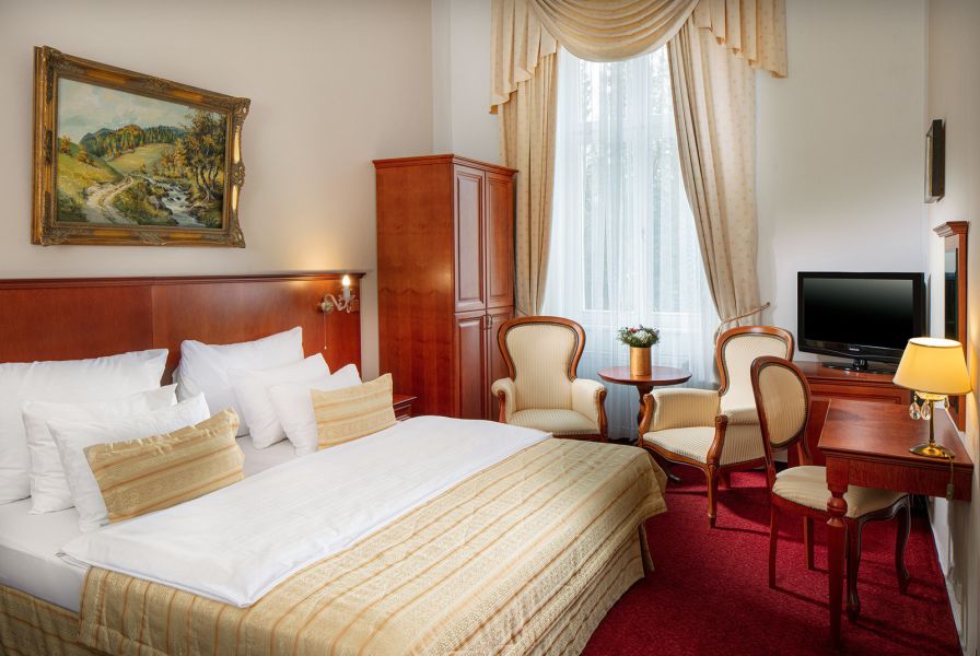 Pokoj s menší rozlohou 20 m2 s výhledem do parku. Na pokoji k dispozici župan a pantofle.