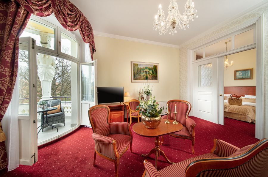 Pokoj s výhledem do parku a s balkonem. K dispozici jsou dva LCD televizory, župan, pantofle, mísa ovoce a láhev sektu. K apartmá náleží jedno parkovací místo zdarma. Obývací pokoj a ložnice s koupelnou.