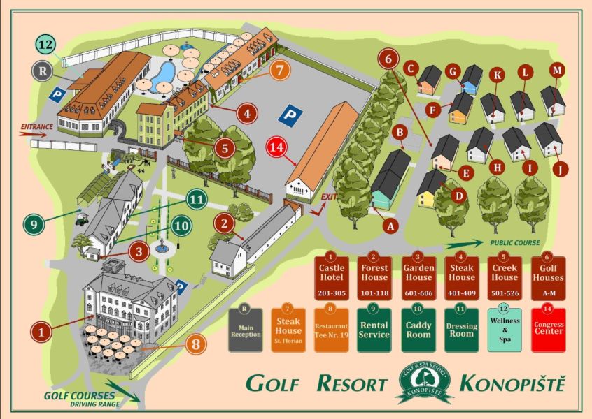 Hotel Golf & Spa resort Konopiště**** je situován přímo v areálu Golf Resortu Konopiště. V osmnácti budovách nabízí 135 komfortních dvoulůžkových pokojů s možností přistýlek. V centrální části resortu se nachází budovy Zámek, Forrest house, Creek house, Garden house a Steakhouse. Ubytovat se můžete také v Golf houses, nacházejících se v těsné blízkosti driving range a veřejného hřiště. Bohaté bufetové snídaně jsou podávány v Restauraci Tee no. 19, která jsou součátí zrekonsturovaného tvoršovického zámečku. Disponuje velikou terasou s výhledem na park. Za návštěvu stojí i Steakhouse St. Florian sídlící v rekonstruované hospodářské budově v těsné blízkosti parkoviště. Je to ideální místo pro pořádání firemních akcí, turnajů, školení, večírků, svateb apod. Součástí restaurace je velká krytá terasa, v letních měsících s klimatizací. Součástí wellness centra je vnitřní a venkovní bazén, vířivka, lázeň, Kneippův chodník, pára nebo sauna. V resortu je možno absolvovat nejrůznější zkrášlující, ozdravné či relaxační procedury - např. masáže, zábaly nebo koupele. K dispozici je také plně vybavená posilovna s běžícími pásy a rotopedy. Parkování na venkovním parkovišti je zdarma.