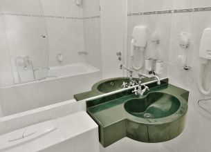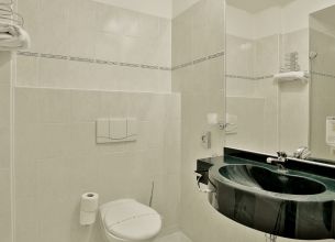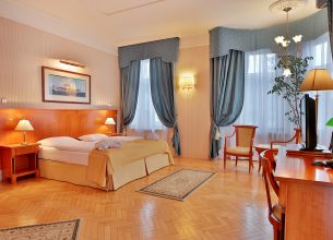 Velikost pokoje cca 15-17 m2. Minibar, trezor, telefon, SAT-TV, Wifi připojení k interentu zdarma. Koupelna se sprchou, fénem a WC. Župan k dispozici.