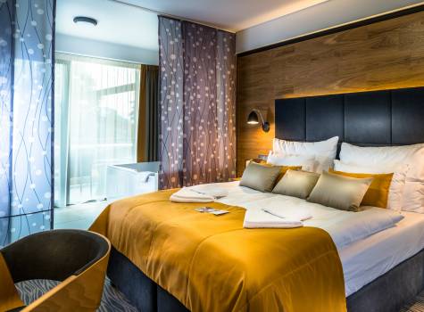 Vybavení pokoje: župany na pokoji, úložný prostor, satelitní TV a telefon, minibar a trezor, bezplatné wifi, vysoušeč vlasů, parkování u hotelu, vlastní koupelna se sprchovým koutem, vířivka, coffee a tea set