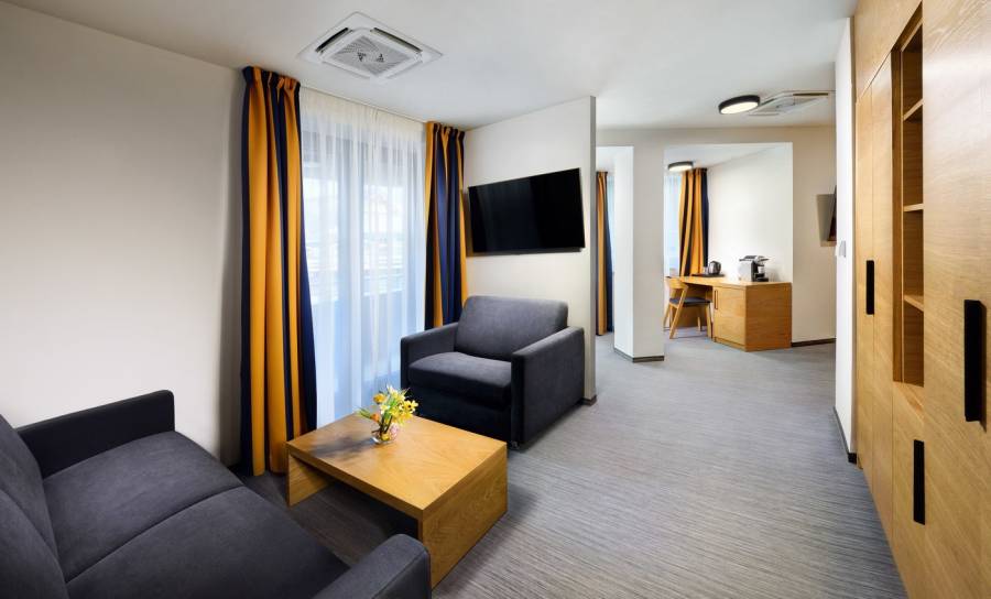 Vítá vás elegantní a velkorysý prostor, kde si můžete užít chvíle klidu a relaxace. Apartmány s výhledem na vodní park nabízejí dokonalou rodinnou dovolenou, ale také romantický pobyt. Světlé dvoulůžkové apartmány nabízejí možnost umístění až dvou přistýlek (rozkládací gauč). Náš apartmán s výhledem do vodního parku je nezapomenutelným místem pro ty, kteří hledají pohodlí a nadstandardní ubytování v jednom.