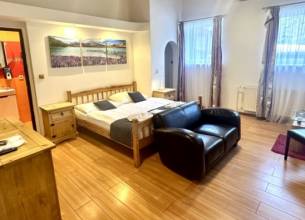 Součástí dvoulůžkového pokoje je televize, minibar, trezor, vlastní koupelna, manželská postel.