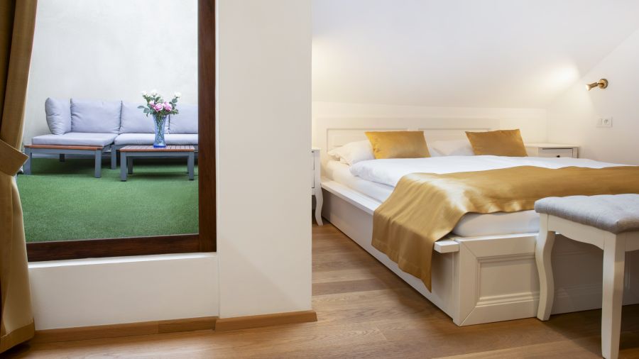 Prostorný pokoj Rudolf II. v kategorii Superior nabízí elegantní ubytování až pro čtyři osoby. Dominantou pokoje je pohodlná manželská postel doplněná rozkládací pohovkou. Velká okna s výhledem do klidné ulice zajišťují příjemnou a nerušenou atmosféru během celého pobytu. Součástí pokoje je stylová koupelna s prostornou volně stojící vanou. Pokoj o velikosti 40 m² je vybaven minibarem, sadou na přípravu kávy a čaje, varnou konvicí, TV, Wi-Fi, pracovním stolem a pohodlnou pohovkou. Hosté mají k dispozici pivní kosmetiku, pantofle a na vyžádání také župan.
