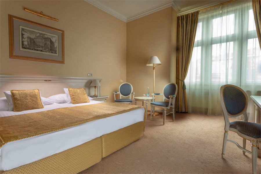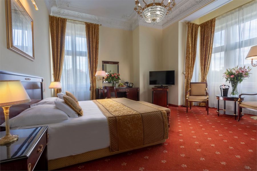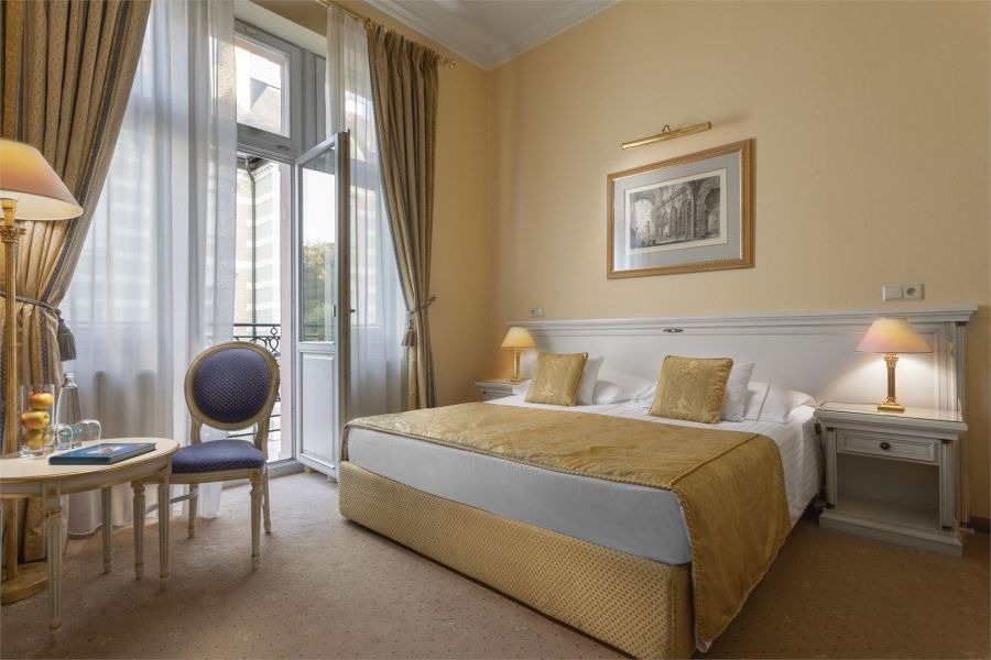 + 1 dalších fotekPokoj Deluxe s balkonem o rozloze 30 až 46 m2 se nachází ve vilách Savoy, Kleopatra a Carlton. Nabízí elegantní prostor pro až tři hosty. Pro větší skupiny nebo rodiny jsou ve vilách Kleopatra a Savoy k dispozici propojené pokoje Deluxe, které poskytují celkovou plochu 66 m2. Každý pokoj je vybaven manželskou postelí velikosti king, na vyžádání jsou k dispozici oddělená lůžka a pro třetího hosta lze přidat přistýlku. Mnoho pokojů Deluxe se pyšní nádherným výhledem na ruský pravoslavný kostel sv. Petra a Pavla. Interiér je vkusně zdoben bohatou červenou a zlatou barevnou kombinací, zdůrazněnou elegantními štukovými stropy a luxusními lustry. Stylové koupelny jsou vybaveny sprchovým koutem nebo vanou. Všechny pokoje jsou klimatizované a nekuřácké.