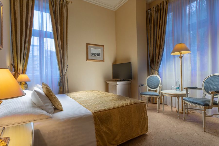 Pokoj Deluxe Single se nachází ve vile Savoy a nabízí 40 m2 elegantního prostoru Je určen pro jednu osobu. Stylová koupelna zahrnuje bidet. Všechny pokoje jsou nekuřácké.
