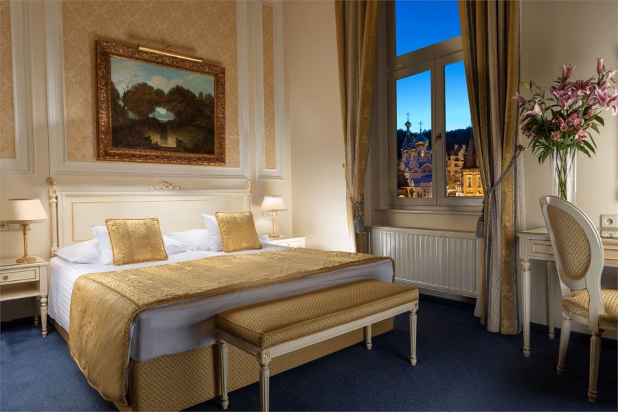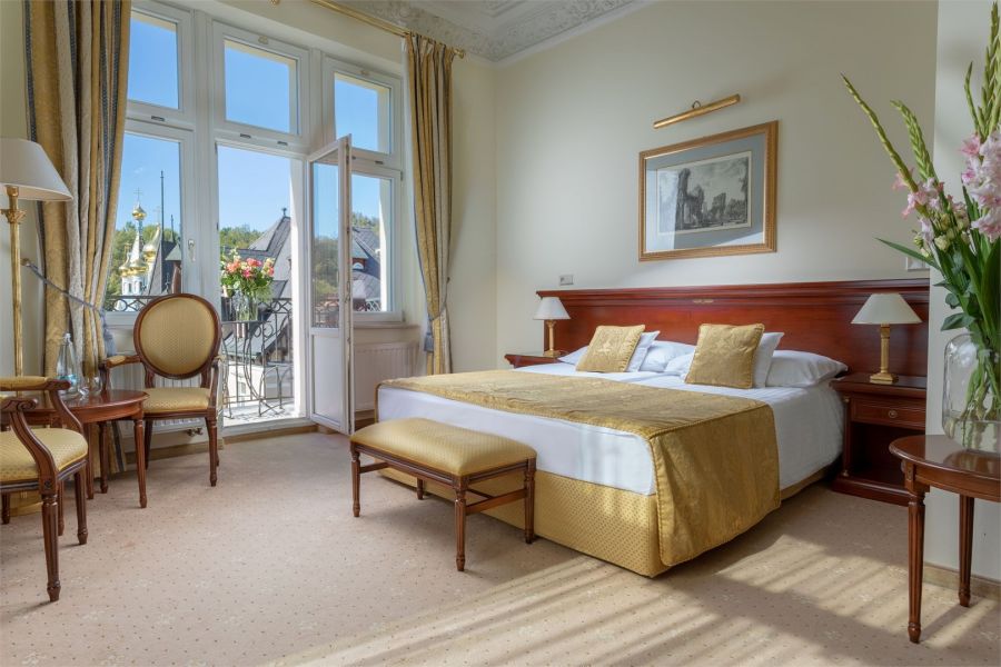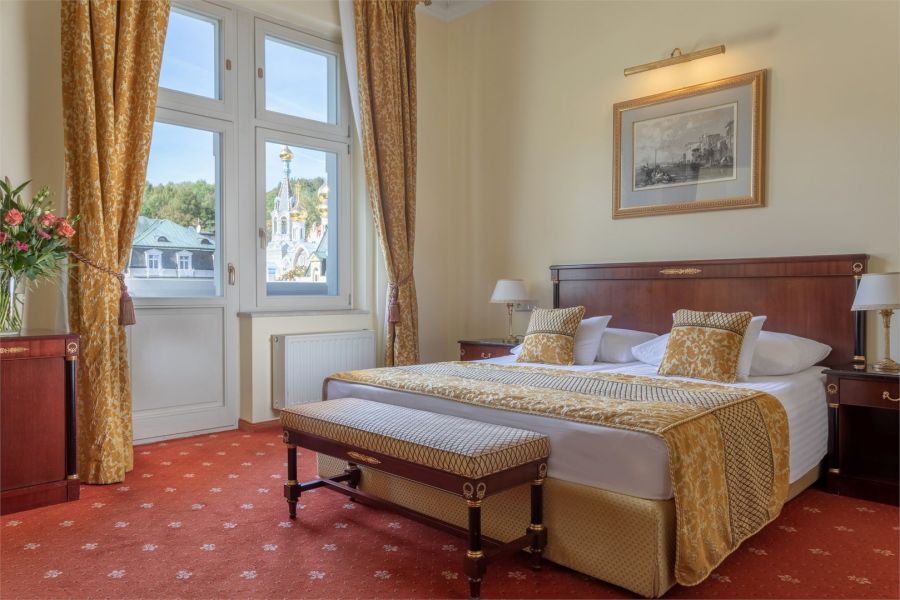 + 1 dalších fotekPokoj s výhledem ze střechy se nachází ve vile Savoy. Nabízí 45 m2 stylově zařízeného a pohodlného prostoru a může ubytovat jednoho, dva nebo tři hosty. Je vybaven manželskou postelí king-size, kterou lze na požádání přeměnit na oddělené postele. Pro třetího hosta lze zajistit přistýlku. Pokoj zahrnuje krásně zdobenou koupelnu se sprchou a svým prostorným uspořádáním zajišťuje maximální pohodlí i při delším pobytu. Tento pokoj se může pochlubit exkluzivní terasou s dechberoucím výhledem na malebné Karlovy Vary a ruský pravoslavný kostel sv. Petra a Pavla. Všechny pokoje jsou klimatizované a nekuřácké.