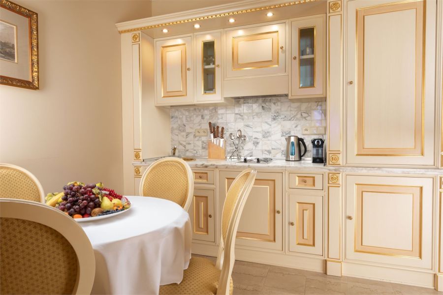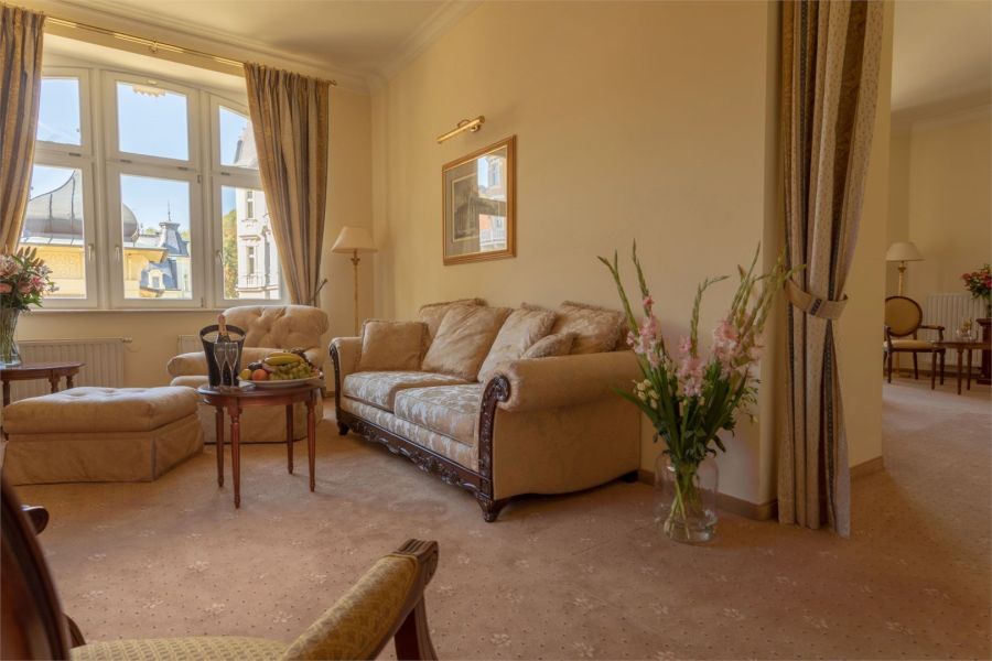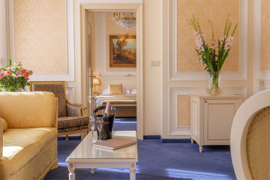 + 2 dalších fotekJunior Suite o rozloze 55 m2 se nachází ve vile Carlton a pohodlně ubytuje až čtyři hosty. Je vybaven manželskou postelí velikosti king, přičemž na vyžádání jsou k dispozici oddělená lůžka. Pro třetího a čtvrtého hosta je k dispozici rozkládací pohovka. Všechny Junior Suite zahrnují prostorný balkon o velikosti 21 m2 s nádherným výhledem na ruský pravoslavný kostel sv. Petra a Pavla. Nedávno zrekonstruované apartmány jsou laděny do elegantních tmavě modrých tónů, doplněných dubovým nábytkem a pečlivě vybranými interiérovými detaily. Jedinečný pozlacený nábytek dodává apartmánům sofistikovaný vzhled. Každý suite disponuje dvěma samostatnými koupelnami, z nichž jedna obsahuje vanu. Všechny pokoje jsou klimatizované a nekuřácké.