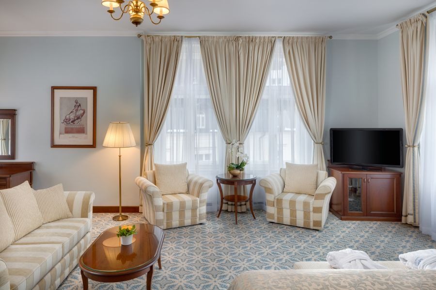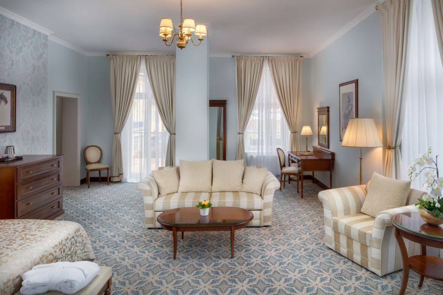 Prostorný a luxusní pokoj v krásném dekoru s výhledem na lázeňský park a kolonádu: noční stolek s lampičkou, šatník, psací stůl, židle se stolkem, nástěnné zrcadlo, LED televize (satelitní kanály), dobíjecí stanice na iPod, radiobudík, telefon, mini lednice s minibarem, trezor, sada na přípravu kávy a čaje, žehlička a žehlicí prkno, nezávisle ovládaná klimatizace a centrální vytápění, Wi-Fi, vlastní koupelna s vanou/sprchou nebo sprchou, WC, bidet, umyvadlo, zrcadlo a kosmetické zrcadlo, fén, telefon, lázeňské osušky, župan, froté pantofle a toaletní potřeby Všechny pokoje mají balkon nebo terasu.