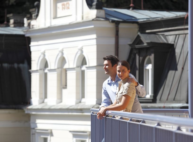 Prostorný a luxusní pokoj pro dva v krásném dekoru s výhledem na lázeňský park a kolonádu: Ložnice s velkou manželskou postelí nebo dvěma velkými postelemi, noční stolek s lampičkou, šatník, psací stůl, židle se stolkem, nástěnné zrcadlo, LED televize (satelitní kanály), dobíjecí stanice na iPod, radiobudík, telefon, mini lednice s minibarem, trezor, sada na přípravu kávy a čaje, žehlička a žehlicí prkno, nezávisle ovládaná klimatizace a centrální vytápění, Wi-Fi. Vlastní koupelna s vanou/sprchou nebo sprchou, WC, bidet, umyvadlo, zrcadlo a kosmetické zrcadlo, fén, telefon, lázeňské osušky, župan, froté pantofle a toaletní potřeby Na vyžádání lze přidat přistýlku. Všechny pokoje mají balkon nebo terasu.