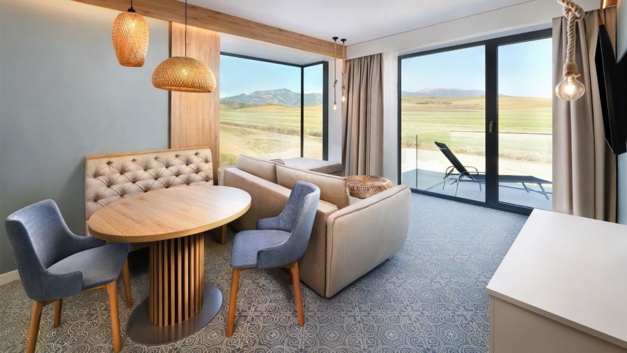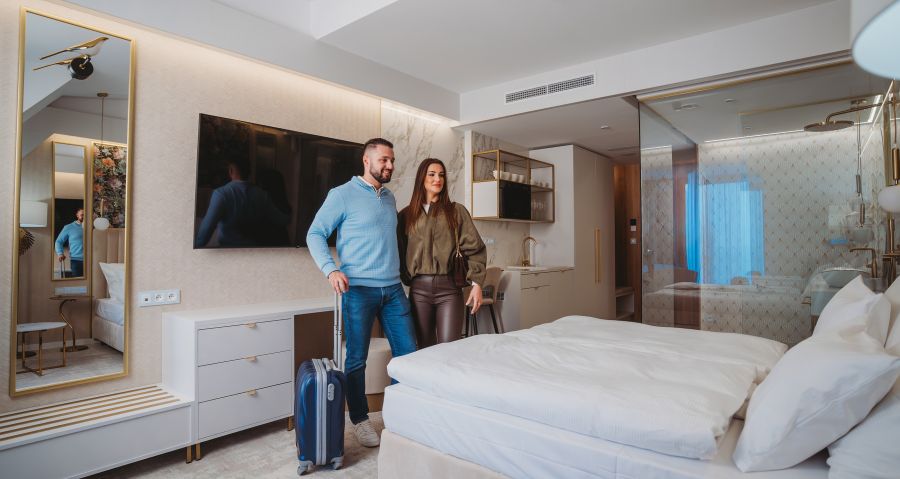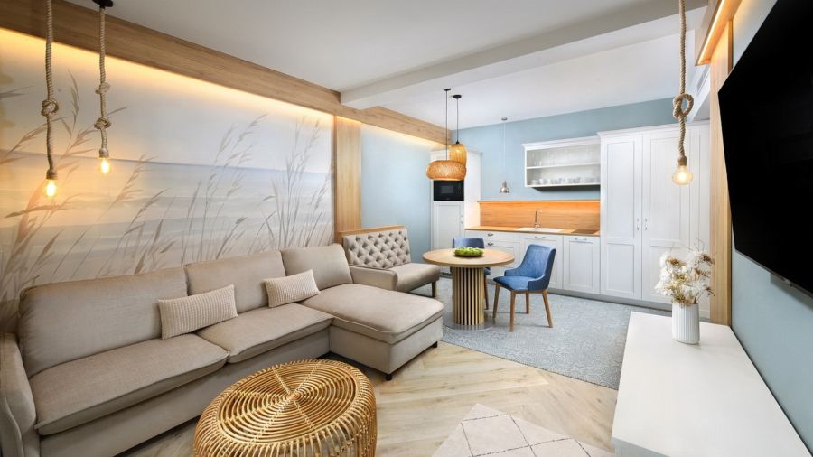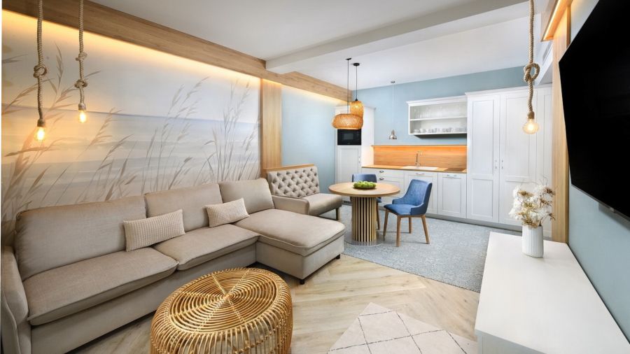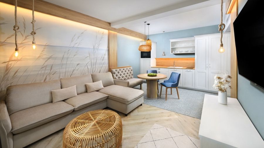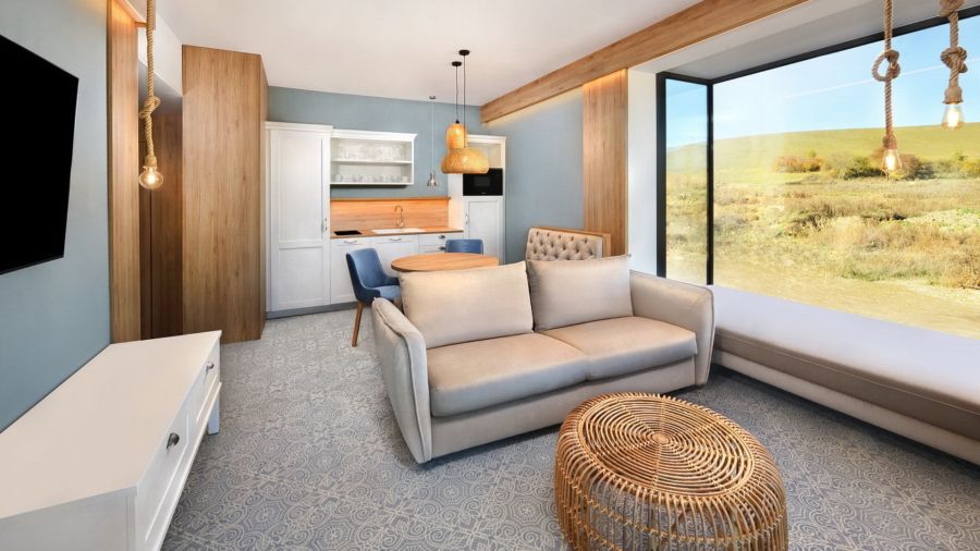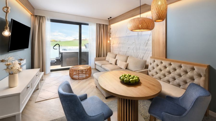 Apartmán Exclusive s privátní vířivkou nabízí stylové ubytování pro náročné hosty. Komfortní ložnice, oddělená od obývací části s TV, zaručuje klidný spánek. Součástí je plně vybavený kuchyňský kout, rozkládací gauč a prostorná terasa s vířivkou pro relax pod širým nebem. Apartmán disponuje koupelnou se sprchou, WiFi a výhledem na relaxační jezírko. Ideální volba pro páry i rodiny hledající pohodlí a soukromí.