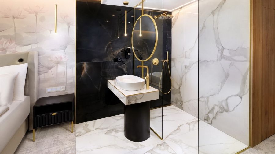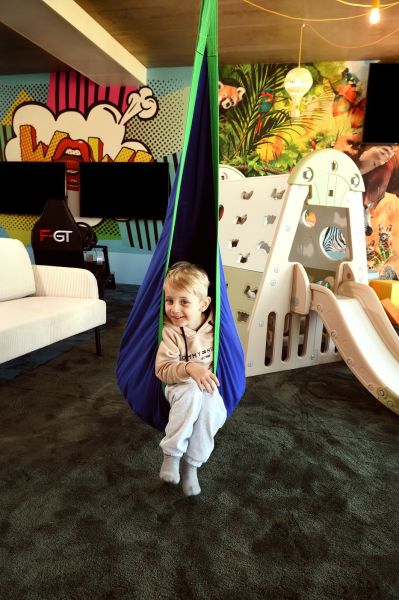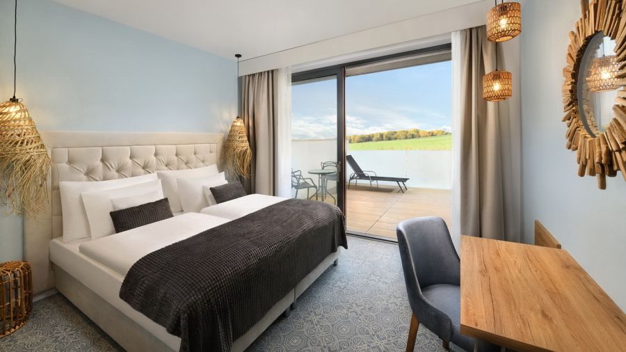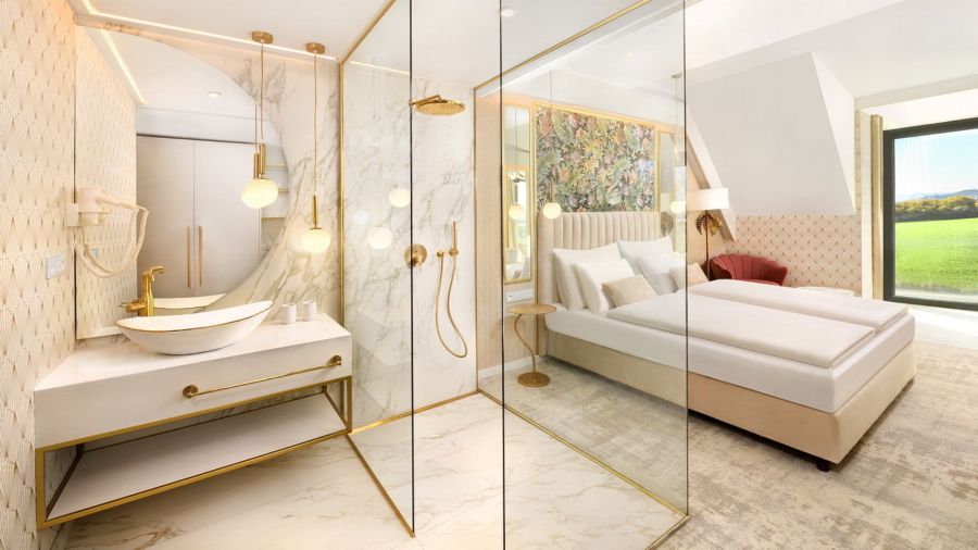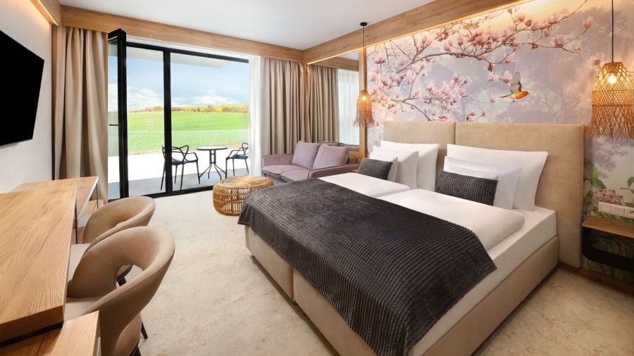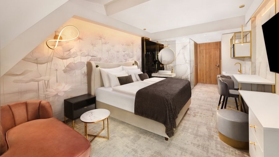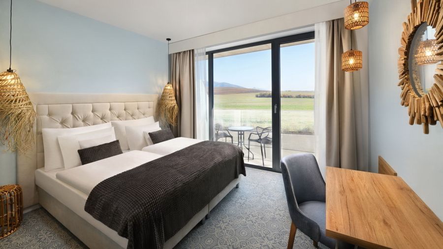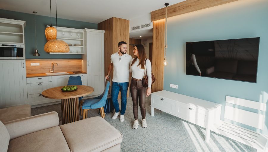 Apartmán Exclusive s privátní vířivkou nabízí stylové ubytování pro náročné hosty. Komfortní ložnice, oddělená od obývací části s TV, zaručuje klidný spánek. Součástí je plně vybavený kuchyňský kout, rozkládací gauč a prostorná terasa s vířivkou pro relax pod širým nebem. Apartmán disponuje koupelnou se sprchou, WiFi a výhledem na relaxační jezírko. Ideální volba pro páry i rodiny hledající pohodlí a soukromí.