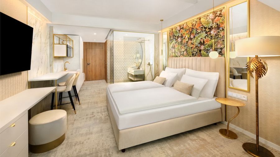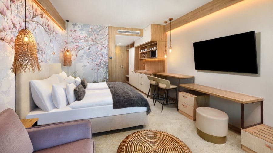 Studio Garden nabízí útulné ubytování s balkonem a výhledem na bazény. Komfortní ložnice s možností manželské postele nebo oddělených postelí zajistí příjemný odpočinek, zatímco rozkládací gauč slouží jako přistýlka. Součástí je vybavený kuchyňský kout, koupelna se sprchou a praktické vybavení včetně WiFi, TV či trezoru. Ideální volba pro páry i menší rodiny hledající pohodlí, soukromí a příjemnou atmosféru.