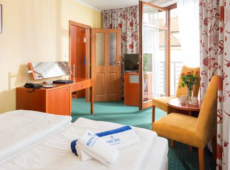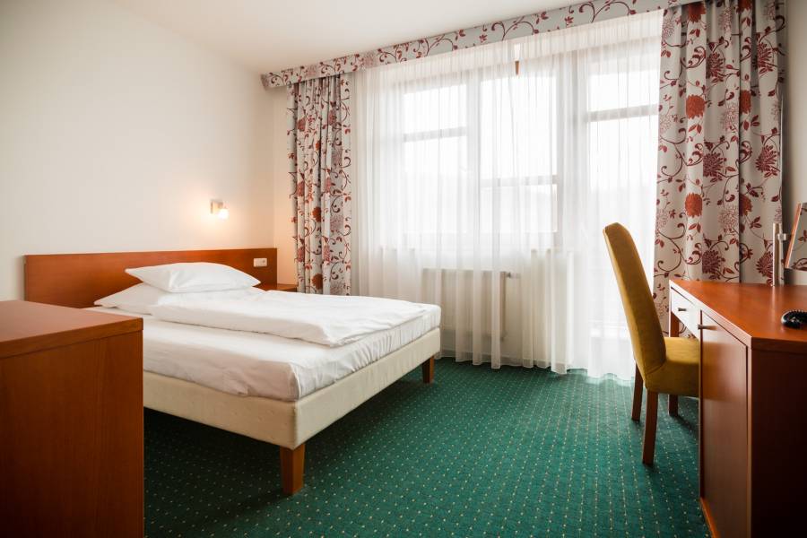 Jednolůžkové pokoje standard se nacházejí ve Vile Pernštýn a ve Vile Petřín (bez výtahu). Minibar na vyžádání.