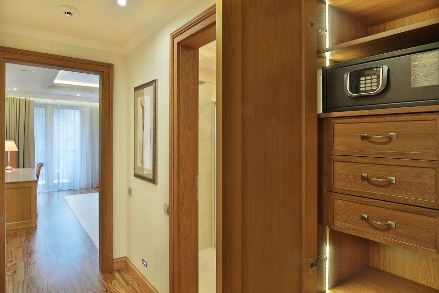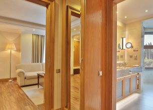 Dvoupokojové apartmá s plochou 56 m2 umístěné v rozích budovy ve 2.a 3. patře. Velkorysá terasa s panoramatickým výhledem do krajiny. Individuální klimatizace. Manželská postel o rozměrech 2x2m, obývací pokoj s rozkládací pohovkou. Minibar, trezor, telefon, SAT-TV, Wifi bezdrátové připojení zdarma. Koupelna se sprchou a vanou, kosmetickým zrcátkem, fénem, 2 umyvadly a bidetem. Vytápěná podlaha, župany k dispozici.