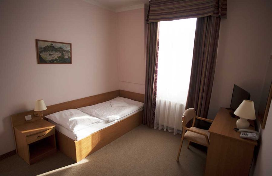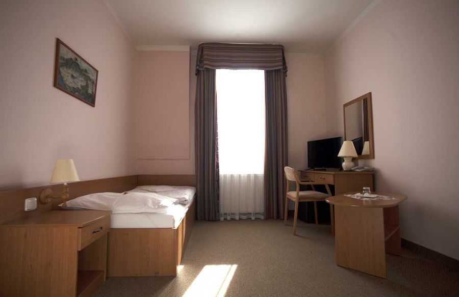 Jednolůžkový pokoj s výhledem na náměstí, koupelna se sprchou a WC, lednice, psací stůl, ručníky a osušky, telefon, trezor, TV s plochou obrazovkou a satelitním příjmem, fén, WI-FI.