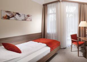 Jednolůžkový pokoj s vlastním příslušenstvím umístěný v čelní části, s balkonem. Součástí pokoje je TV, Wi-Fi, telefon, minibar, fén