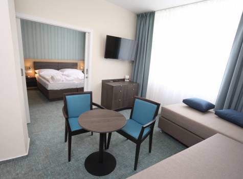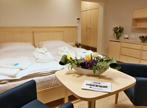+ 1 dalších fotekDvoupokojové apartmá v hlavní budově (pro max. 3 osoby): obývací pokoj a ložnice, koupelna se sprchovým koutem a WC, fén, sat. TV včetně programů rádií, telefon, lednice, varná konvice, klimatizace, bezpečnostní schránky, WiFi, pantofle, župany. Apartmá B7 se nachází v pavilonu B (50 m od hlavní budovy lázní).