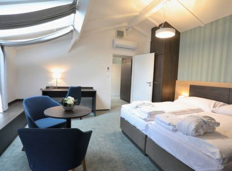 Dvoupokojové apartmá (pro max. 3 osoby): obývací pokoj a ložnice, koupelna se sprchovým koutem a WC, fén, sat. TV včetně programů rádií, telefon, lednice, varná konvice, klimatizace, bezpečnostní schránky, WiFi, župany, pantofle, balkon.