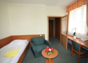 Součástí jednolůžkového pokoje je koupelna se sprchovým koutem. Některé pokoje mají balkon. Sortiment "minibar" je možno zakoupit na recepci.