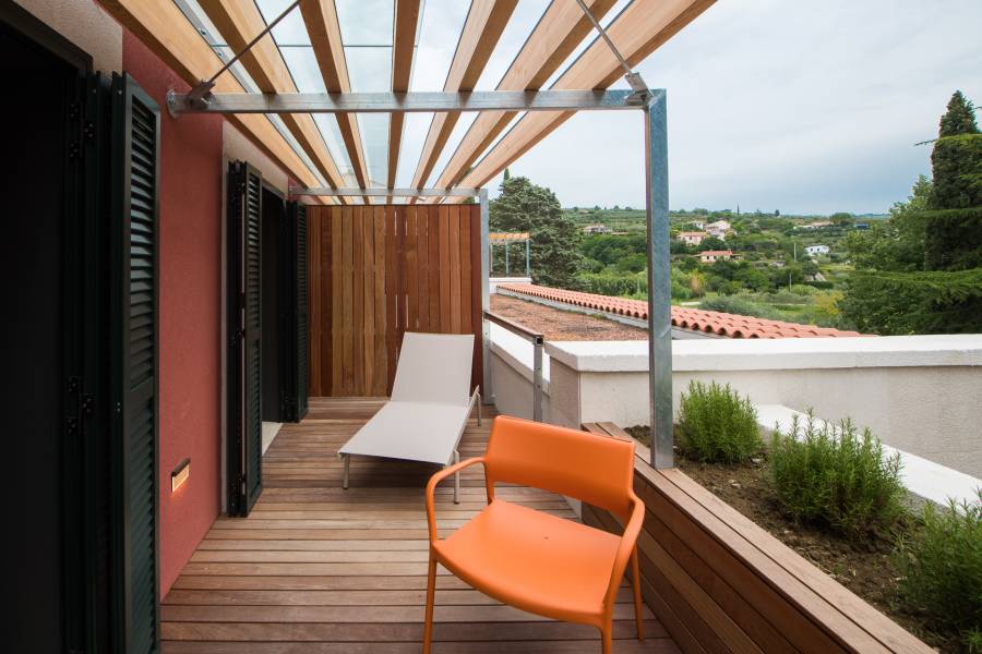Hotelový pokoj s větší postelí (180 x 210 cm) a koupelnou se sprchovým koutem. V pokoji s balkonem a výhledem na moře je k dispozici vysoušeč vlasů, TV, telefon, minibar, bezdrátové připojení k internetu. Pro hosty je k dispozici také výtah. Pokoje jsou klimatizované. Tento pokoj je s vířivkou.