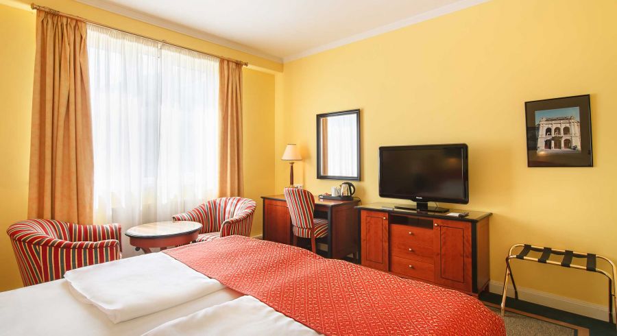 Pokoj zařízený v útulných teplých barvách. Klimatizace, vlastní koupelna s WC a sprchou/vanou. K dispozici župan a pantofle. Čajový set, telefon, SAT-TV, minibar, trezor, DVD přehrávač (na vyžádání). Některé pokoje s balkonem. Wifi zdarma. Rozloha pokoje 14-17 m2.