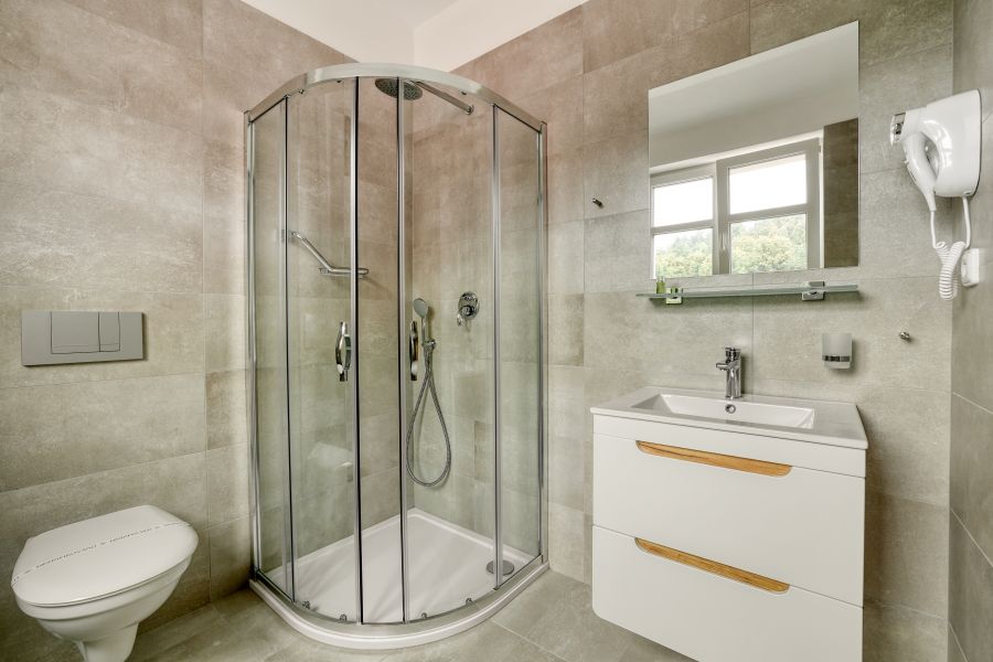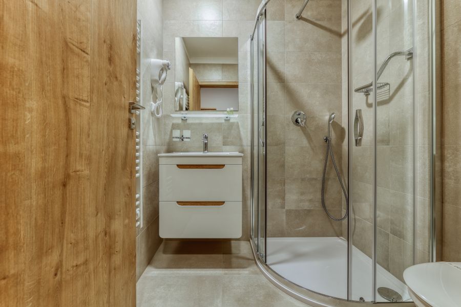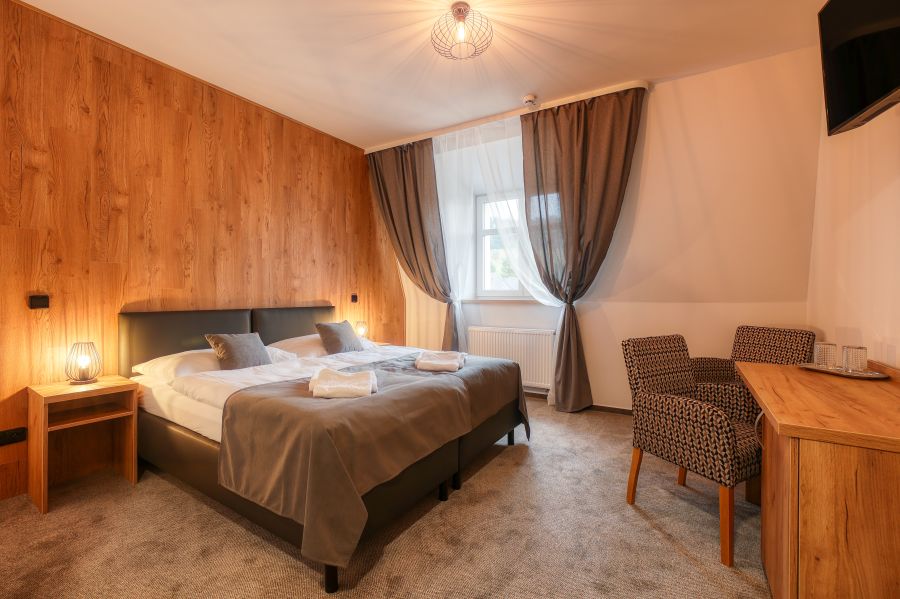 Dvoulůžkový pokoj zařízený v příjemném designu disponuje vlastní koupelnou se sprchovým koutem a WC. Součástí pokoje je lednička, TV, fén, župan i WiFi. Na některé pokoje lze umístit přistýlku.