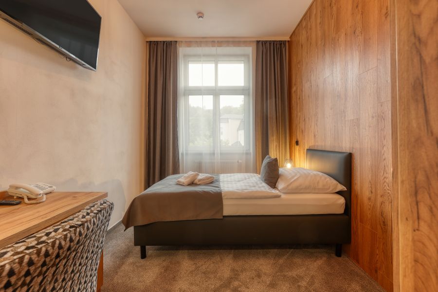 + 3 dalších fotekJednolůžkový pokoj zařízený v příjemném designu disponuje vlastní koupelnou se sprchovým koutem a WC. Součástí pokoje je lednička, TV, fén, župan i WiFi.
