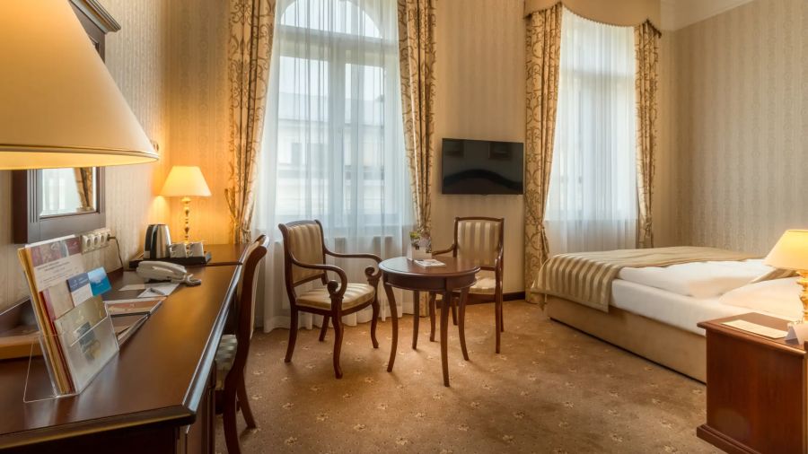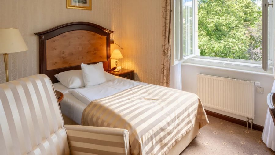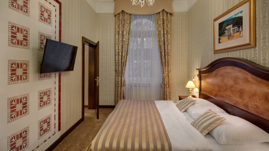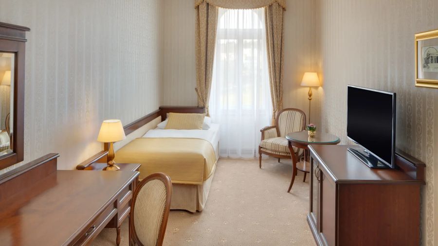 + 3 dalších fotekPohodlný a přívětivý pokoj pro jednoho v italském novorenesančním stylu s pracovním stolem, komodou, posezením – křesla a židle, pohovkou, nástěnným zrcadlem, LED televizí (kabelové a rádiové kanály), telefonem, mini lednicí s minibarem, sadou na přípravu kávy a čaje, Wi-Fi, LED televizí (kabelové a rádiové kanály). Vlastní koupelnou s vanou nebo sprchou, WC, bidetem, osvětleným kosmetickým zrcadlem, fénem, osuškami, županem, froté pantoflemi a toaletními potřebami.