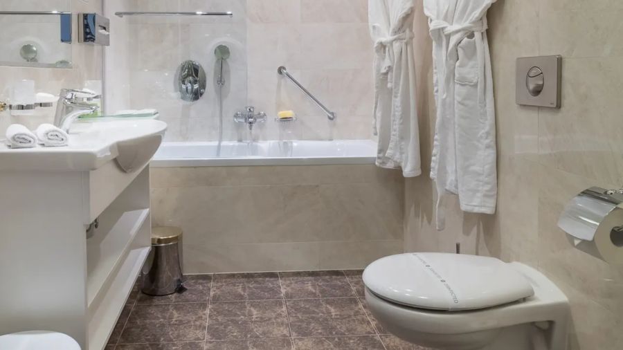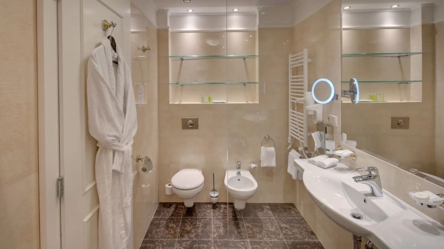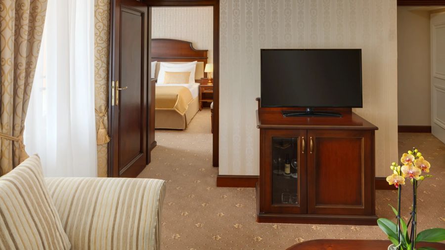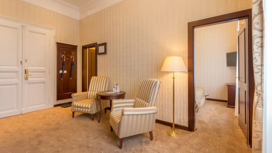 + 2 dalších fotekApartmá s oddělenou ložnicí a obývacím pokojem. Vkusně zařízené pokoje vybavené sedacím nábytkem, komodou a pracovním stolem. Nechybí zde LED televize s kabelovými a rádiovými kanály, lednička s minibarem, sada na přípravu kávy nebo čaje, klimatizace a ústřední vytápění. Na pokoji se dále nachází vlastní koupelna s vanou nebo sprchou, WC, bidet, osvětleným kosmetickým zrcadlem a fén a osušky.