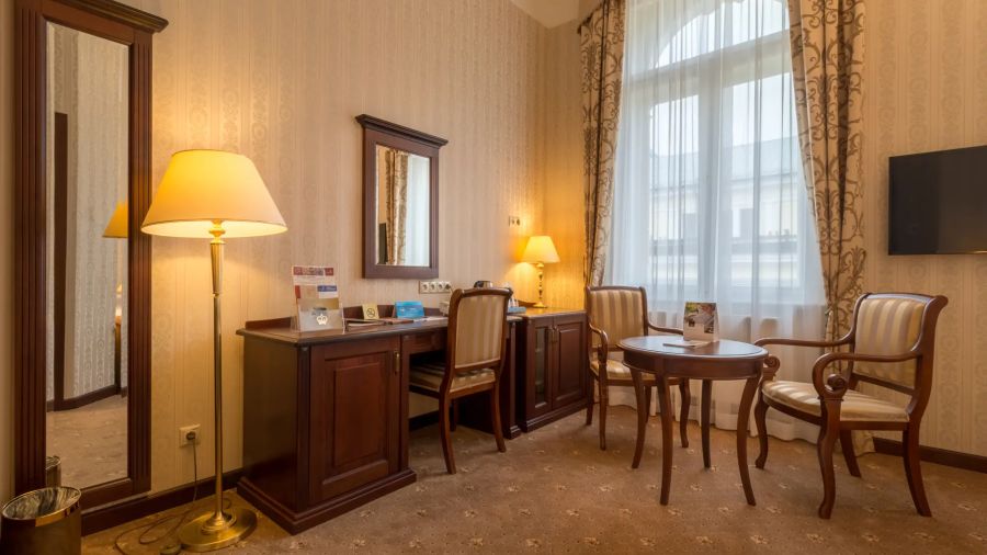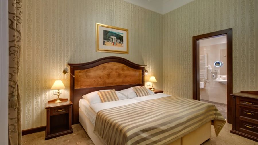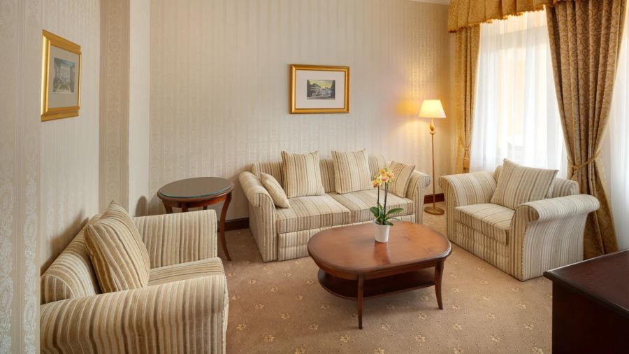Pohodlný a přívětivý junior suite v italském novorenesančním stylu s ložnicí a obývacím pokojem s pracovním stolem, komodou, posezením – křesla a židle, pohovkou, nástěnným zrcadlem, LED televizí (kabelové a rádiové kanály), telefonem, mini lednicí s minibarem, sadou na přípravu kávy a čaje, s možností Wi-Fi, LED televizí (kabelové a rádiové kanály). Vlastní koupelnou s vanou nebo sprchou, WC, bidetem, osvětleným kosmetickým zrcadlem, fénem, osuškami, županem, froté pantoflemi a toaletními potřebami.