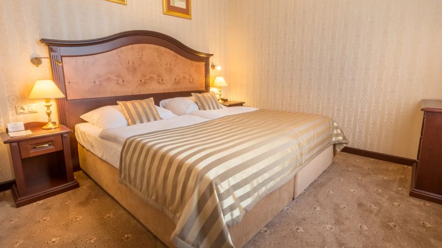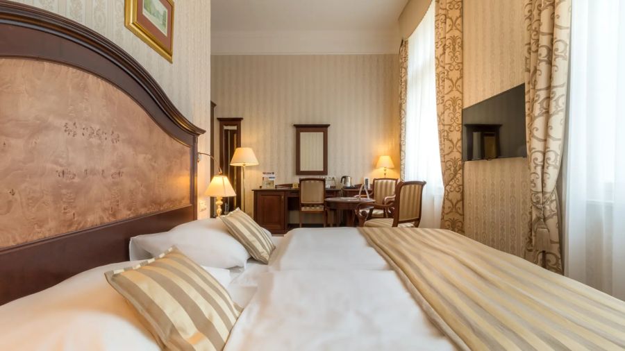 Pohodlný dvoulůžkový Superior Deluxe v italském novorenesančním stylu s manželskou postelí, pracovním stolem, komodou, posezením – křesla a židle, pohovkou, nástěnným zrcadlem, LED televizí (kabelové a rádiové kanály), telefonem, mini lednicí s minibarem, sadou na přípravu kávy a čaje, Wi-Fi, LED televizí (kabelové a rádiové kanály). Vlastní koupelnou s vanou nebo sprchou, WC, bidetem nebo bidetovou sprchou, osvětleným kosmetickým zrcadlem, fénem, osuškami, županem, froté pantoflemi a toaletními potřebami.