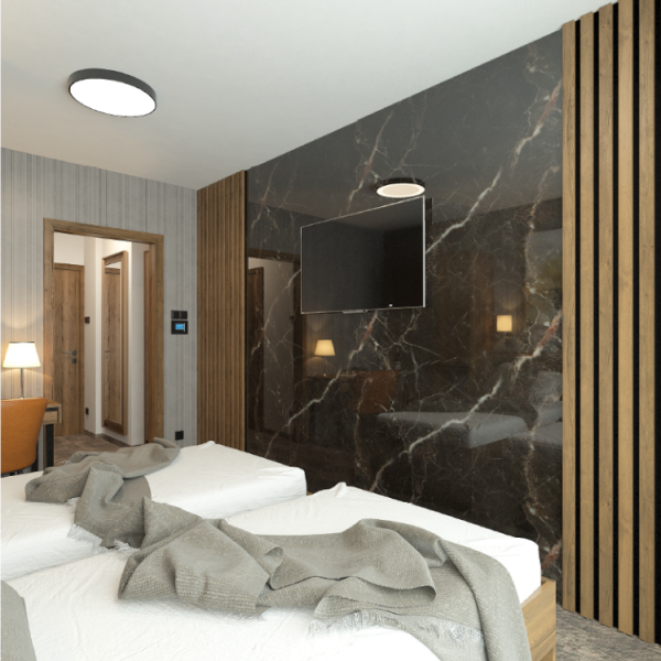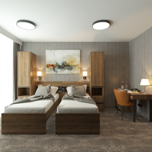 Dvoulůžkový pokoj vybavený TV, sociálním zařízením, telefonem, připojením na internet a chladničkou.