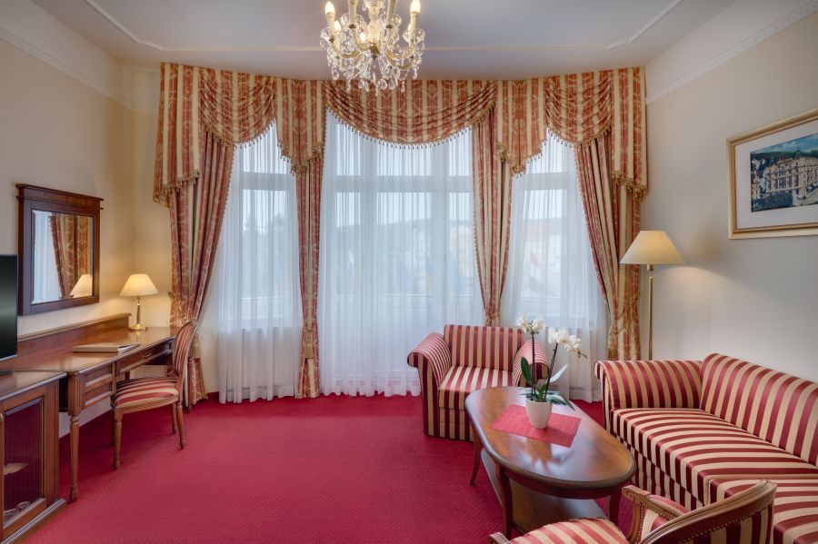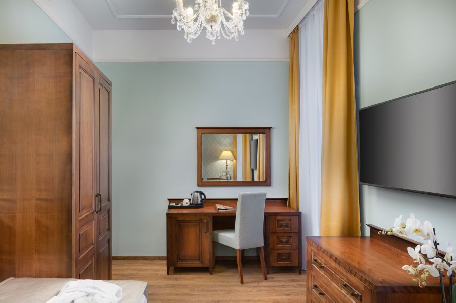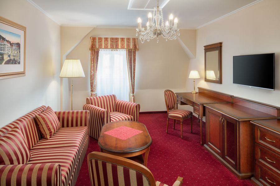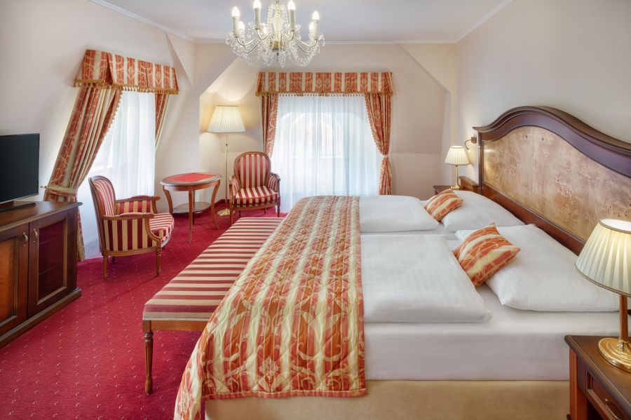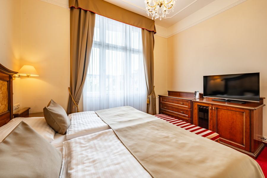 Pohodlný a prostorný pokoj s: Ložnicí se dvěma velkými postelemi, nočním stolkem s lampičkou, šatníkem, šatní skříní, psacím stolem, posezením s křesly a stolkem, nástěnným zrcadlem, LED televizí (satelitní kanály), telefonem, mini lednicí s minibarem, trezorem, sadou na přípravu kávy a čaje, centrálním vytápěním, Wi-Fi, některé pokoje s balkonem. Vlastní koupelnou s vanou/sprchou, toaletou, umyvadlem, zrcadlem, kosmetickým zrcadlem, fénem, lázeňskými osuškami, županem, froté pantoflemi a toaletními potřebami. Přistýlka je k dispozici na vyžádání.