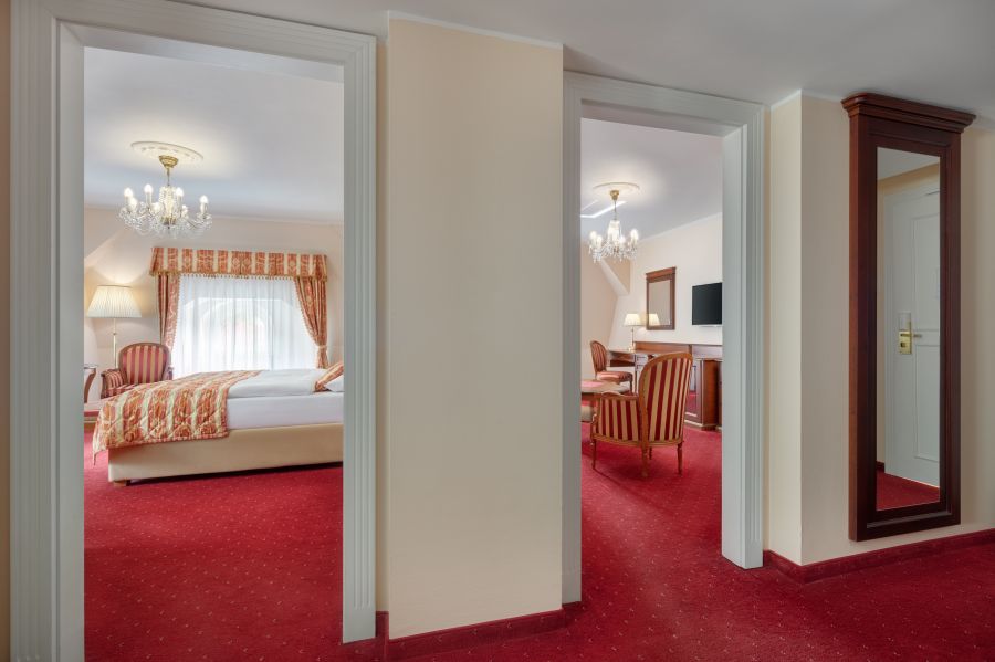 + 2 dalších fotekVelmi prostorný apartmán se samostatným pokojem a ložnicí a s krásným výhledem na Goethovo náměstí: Ložnice se dvěma velkými postelemi, nočním stolkem s lampičkou, nástěnným zrcadlem, LED televizí (satelitní kanály), telefonem. Pokoj se šatníkem, šatní skříní, psacím stolem, posezením s pohovkou, křesly a stolkem, nástěnným zrcadlem, LED televizí (satelitní kanály), telefonem, mini lednicí s minibarem, trezorem, sadou na přípravu kávy a čaje, centrálním vytápěním, Wi-Fi. Vlastní koupelna s vanou/sprchou, toaletou, umyvadlem, zrcadlem, kosmetickým zrcadlem, fénem, lázeňskými osuškami, županem, froté pantoflemi a toaletními potřebami. Přistýlka je k dispozici na vyžádání.