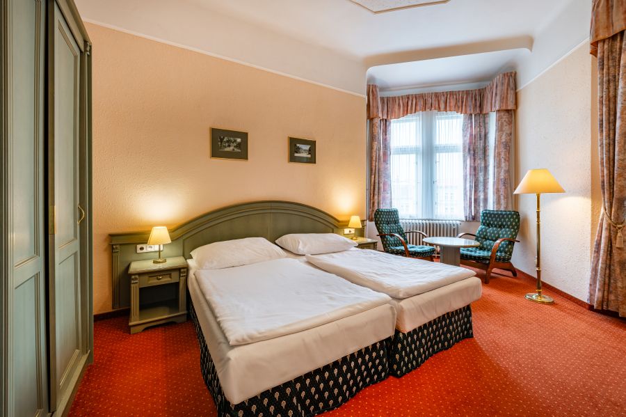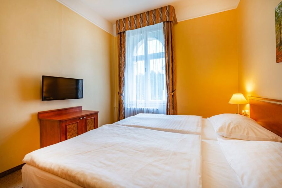 + 6 dalších fotekDvoulůžkové pokoje s výhledem do parku. Pokoje obsahují dvě samostatné postele, šatník, noční stolky s lampičkou, psací stůl a TV. Pokoje disponují vlastní koupelnou s vanou se sprchou, toaletou, umyvadlem, zrcadlem a toaletními potřebami.