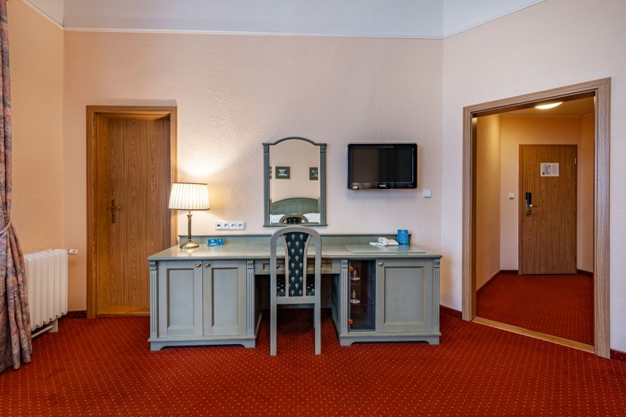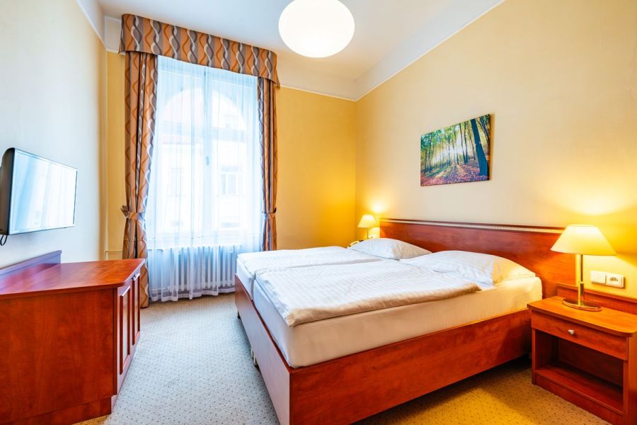 Prostorné dvoulůžkové pokoje s nočními stolky, šatní skříní, psacím stolem, nástěnným zrcadlem a TV. Pokoje disponují vlastní koupelnou s vanou se sprchou, toaletou, umyvadlem, zdrcadlem a toaletními potřebami.