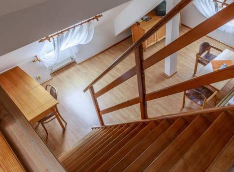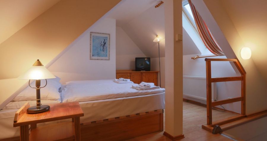 vlastnosti: 35 m2, bez balkónu, vana, dvoupodlažní pokoj Konfigurace: 2x jednolůžko, 1x dvoulůžko vybavení: Wi – Fi, lednice, televizor, telefon, pracovní stůl, pohovka, vysoušeč vlasů, toaletní potřeby, ručníky, na požádání dětská postýlka a dětská židlička, žehlící set, stolička v koupelně, TP set (protialergenní set prošívaného polštáře a přikrývky s výplní z kvalitního českého mikrovlákna)