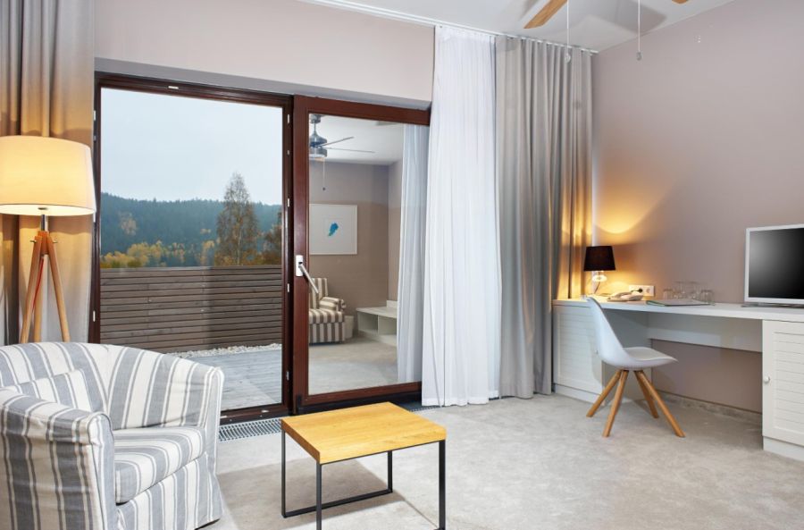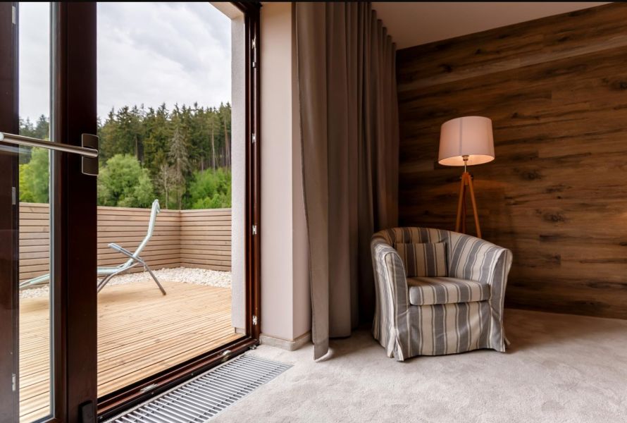 Pokoje Superior s výhledem na les jsou orientovány na jihozápad do lesa a mají příjemný malý balkon pro večerní relaxaci. Čeká vás prostorná šatní skříň a pohodlná manželská postel o rozměrech 180×200. Minimální plocha pokoje Superior je 22 m2. Cena zahrnuje volný vstup do Spa Academy.