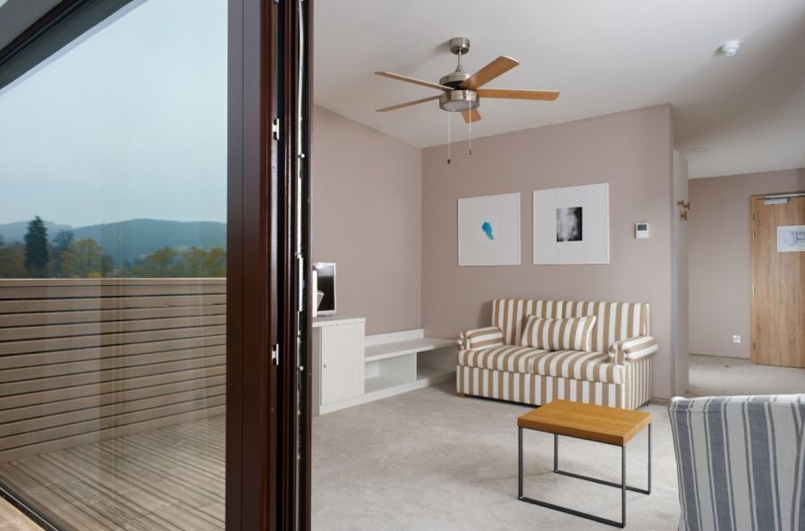 Velkoryse pojatý Junior suite si zamilujete hned, jak poprvé otevřete dveře. Moderní koupelnu se sprchou, pohodlnou pohovku v obývací části pokoje i postel o rozměrech 180 x 200. I tady najdete veškeré standardní vybavení (TV, minibar, trezor či fén).Tyto pokoje nemají balkon, z okna si ale užijete výhled na golfové hřiště. Jejich velikost je 40 m2. Cena ubytování zahrnuje také vstup do wellness Spa Academy.